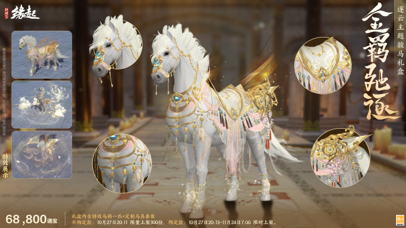 全套马具可开启专属特效,神骏略作腾跃,便得生双翼,凌霄展翅。轻云翻涌,化作薄雾,托举其踏步而行,又轻盈落下。