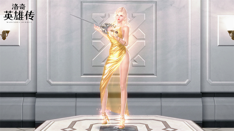 S级“特别闪耀版雍容晚礼服套装选择礼盒”是一款一直以来深受英雄们喜爱的礼服外观,金色半透明亮面纱质,腰部褶皱加上高开衩设计,再配以超高细带高跟鞋,尽显艾琳女性角色的优美线条与优雅气质。