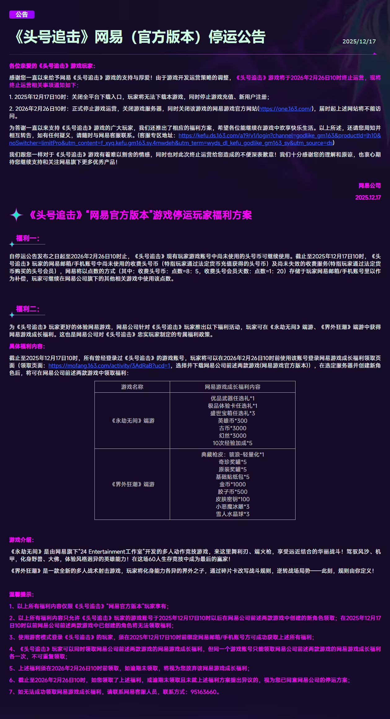截止至 2025 年 12 月 17 日 10 时,《头号追击》玩家的网易邮箱 / 手机账号中尚未使用的收费头号币(特指玩家通过法定货币充值获得的头号币)及尚未失效的收费服务 (特指玩家通过法定货币购买的头号会员),网易将以点数的方式(其中:收费头号币:点数 = 8:5,收费头号会员天数:点数 = 1:20)存储于玩家网易邮箱 / 手机账号里以作为补偿,玩家可继续在网易公司旗下的其他相关游戏中使用该点数。